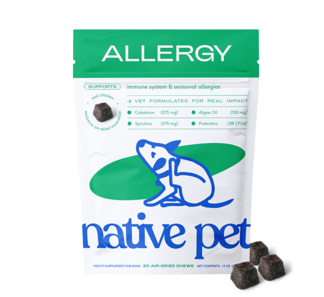 An air-dried chicken chew to soothe itchy skin and seasonal allergies. Powered by colostrum and spirulina with zero starch, fillers, or gums.