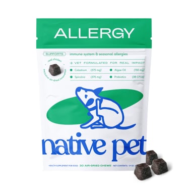 An air-dried chicken chew to soothe itchy skin and seasonal allergies. Powered by colostrum and spirulina with zero starch, fillers, or gums.